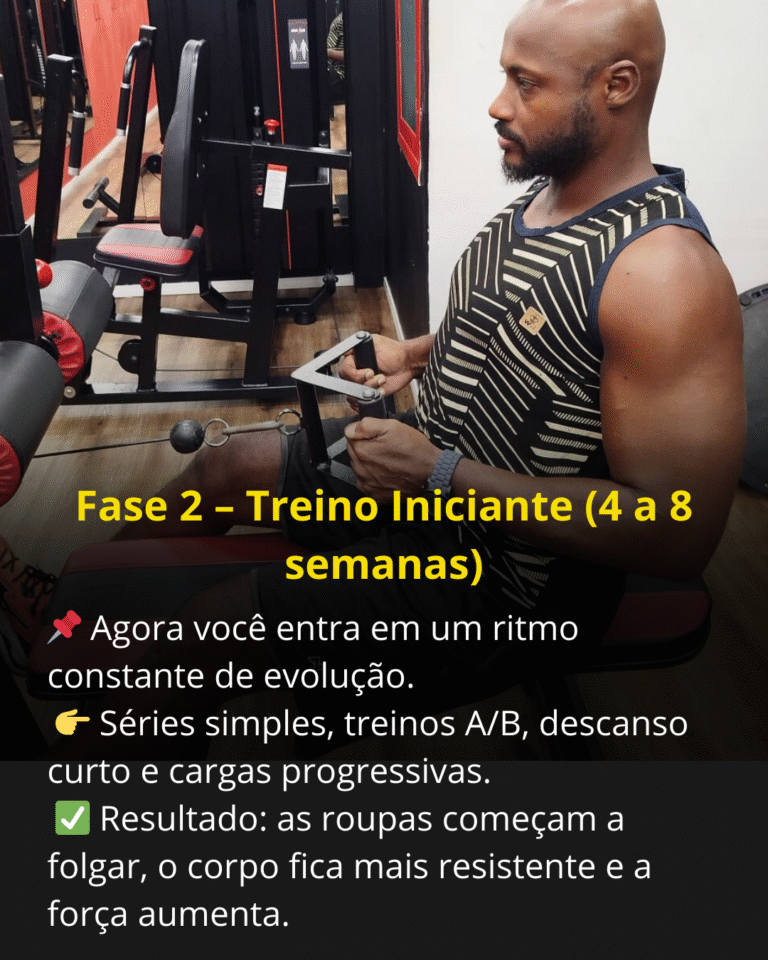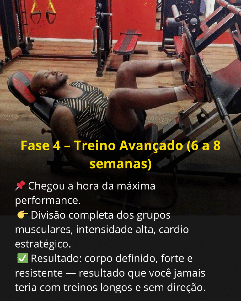 Você não precisa viver na academia. Com apenas 30 minutos por dia, em um plano por fases, você alcança em semanas o que muita gente não consegue em anos de treino desorganizado..